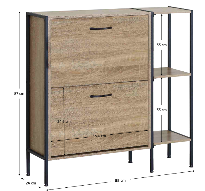 Anyag: faforgács/acél/műanyag Szín: tölgy/fekete Méretek (SzxMéxMa): 88x24x87 cm Anyag vastagsága: 1,2-1,5 cm Lábakon Két billenős fiók A fiók 2 részre van felosztva Billenős fiók méretei (SzxMa): 56,4x34,5 cm Billenős fiók teherbírása: 6 kg Polcok Felső lemez teherbírása: 10 kg Modern dizájn Praktikus