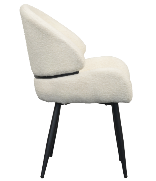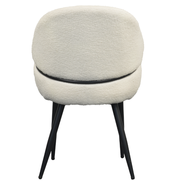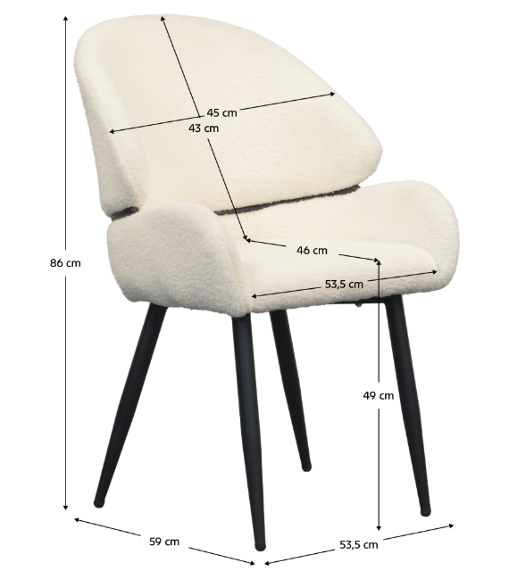 Anyag: Bouclé szövet/fém A szövet kopásállósága a Martindale teszt szerint: 45 000 kopás Szín: fehér/fekete Méretek (SzxMéxMa): 53,5x59x86 cm Ülés magassága: 49 cm Ülés mélysége: 46 cm Ülés szélessége: 53,5 cm Háttámla magassága: 43cm Háttámla szélessége: 45 cm Teherbírás: 100 kg Fém szerkezet Dizájnos Szétszerelve szállítva