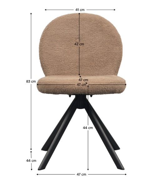 Anyag: Bouclé szövet/fém A szövet kopásállósága Martindale teszt szerint: 45 000 kopás Szín: világosbarna/fekete Méretek (SzxMéxMa): 47x44x83 cm Ülés magassága: 44 cm Ülés szélessége: 47 cm Ülés mélysége: 47 cm Háttámla magassága: 42 cm Háttámla szélessége: 41 cm Teherbírás: 100 kg Súly: 6,2 kg Forgó Étkezői Dizájnos Szétszerelve szállítva