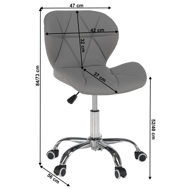 Fotel ARGUS NEW Kiszerelés: szürke/króm Anyag: textilbőr/fém A szövet kopásállósága: 100 000 Martindale Méretek (SzéxMéxMa): 47x56x73-84 cm Ülés magassága: 40-52 cm Ülés mélysége: 37 cm Háttámla magassága: 32 cm Háttámla szélessége: 42 cm Teherbírás: 110 kg Univerzális kerekek puha és kemény padlókhoz egyaránt Állítható ülés magassága Lapraszerelten szállítva.