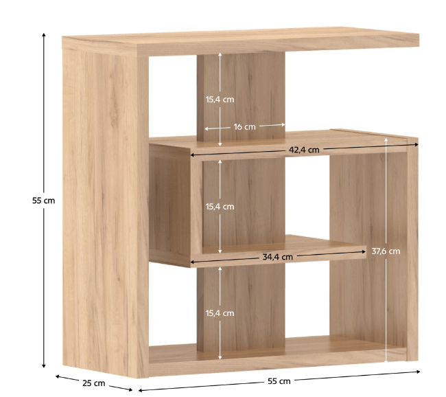 Anyag: laminált DTD Szín: artisan tölgy Méretek (SzxMéxMa): 55x25x55 cm Anyag vastagsága: 2,2 cm Polcok A polcok közötti magasság: 15,4 cm Nyitott tárhely Kisasztal Öntapadós habos csúszásgátlók Teherbírás: 5 kg Súly: 13 kg Modern dizájn Kiváló minőségű szlovák termék Szétszerelve szállítva