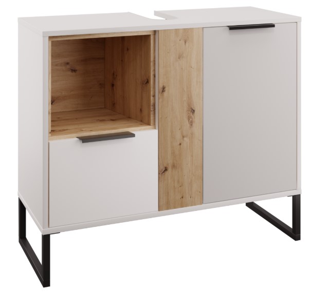 Anyag: laminált DTD Szín: fehér/artisan tölgy Méretek (SzxMéxMa): 88,4x35x75 cm Anyag vastagsága: 1,6 cm Felső lap kivágással a mosdóhoz Kétajtós Polcos Polc teherbírása: 5 kg Nyitott tárolóhely Nyitott tárhely méretei (SzxMa): 31,8x28,4 cm Fém fogantyúk Fogantyúk színe: fekete Lábakon Lábak színe: fekete Lábak magassága: 15,5 cm