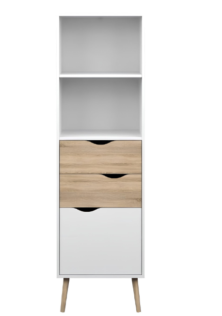 OSLO vitrinszekrény 75382 Anyag: laminált DTD Változat: sonoma tölgy/fehér Méretek (SzéxMéxMa): 50,1x39,1x170,6 cm Egyajtós Nyitott könyvespolc 2 fiók Anyag vastagsága: 1,6 cm Lábak magassága: 15 cm Szállítás szétszerelve